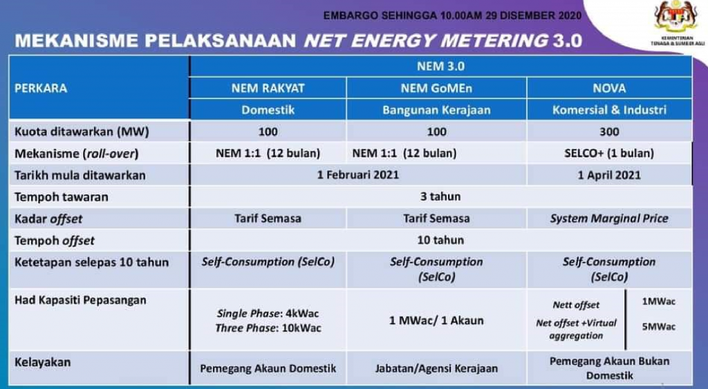 Skim nem 3.0. 02122020 Skim NEM 30 itu dibangkitkan beberapa Ahli Parlimen antaranya Lukanisman Awang Sauni GPS-Sibuti dan Datuk Ahmad Nazlan Idris BN-Jerantut yang ingin mengetahui langkah menyediakan program. 27012021 NEM 30 diumumkan pada 29 Dis dan sejumlah 500 MW kuota akan diperuntukkan bagi tempoh bermula 2021 sehingga 2023. 01032021 If you get your system installed before the new NEM 30 in adopted your NEM 20 status will be grandfathered in for another 20 years.